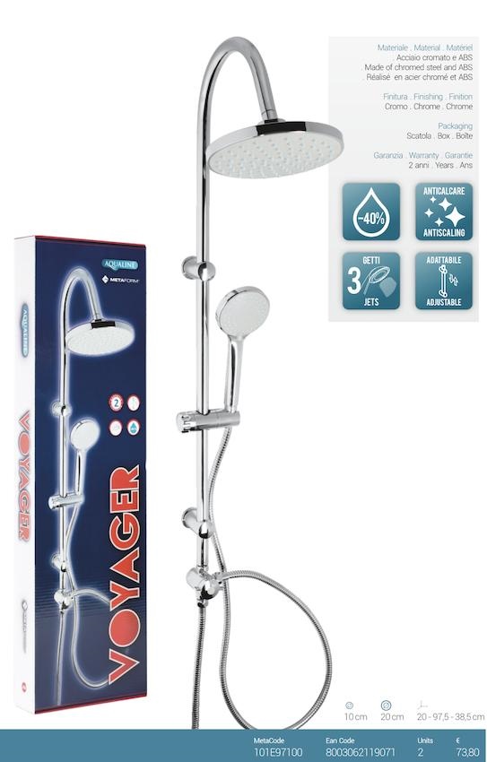 Doccia mix saliscendi modello Voyager Dimensioni: diametro soffione 20 Cm, diametro doccetta 10 Cm, ingombro 20 - h 97,5 - 38,5 cm. Interasse regolabile. Finitura: Cromo Materiale: Acciaio Cromato e ABS Plu.