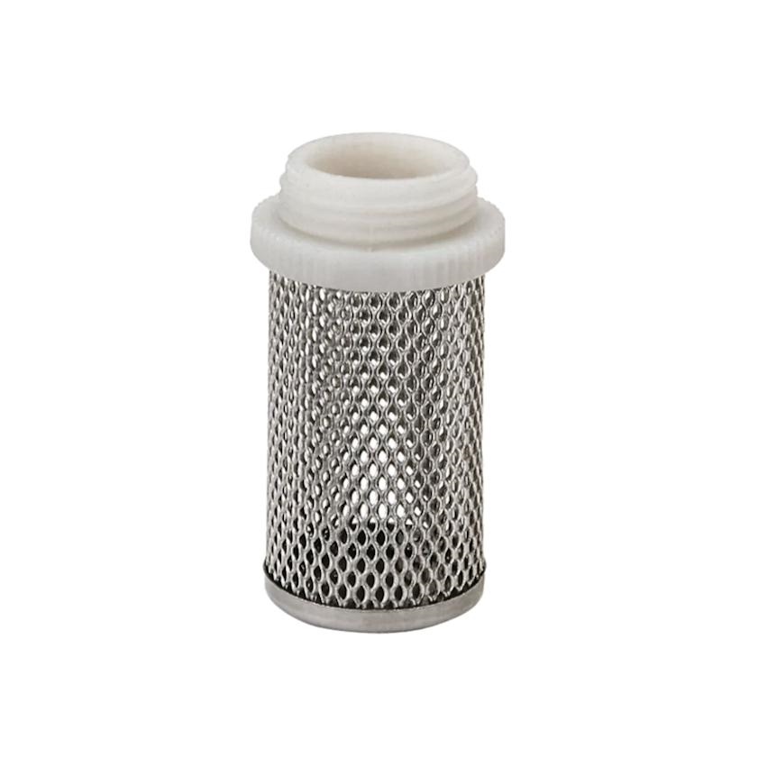 Grado di filtrazione: da 3/8 a 2" 1200µm; da 2"1/2 a 4" 2000µm. Rete in acciaio inox, parte filettata in polimero. Attacco filettato: ISO228