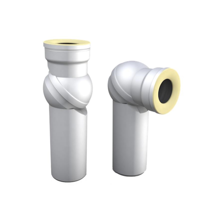 Prolunga snodata da 0° a 90° per vasi Wc. femmina D.80 - 110 mm, maschio D.110 mm. Materiale POLIPROPILENE PP + TPE, colore BIANCO + GIALLO. Applicazione: per vasi Wc sospesi o a pavimento.