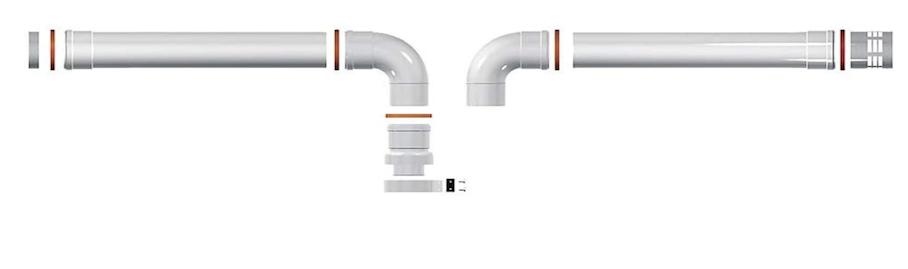 Composto da: 2 curve diametro 80 mm a 90° e 2 prolunghe diametro 80 mm lunghezza 1000 mm. Completo di guarnizioni, viti e fascetta.