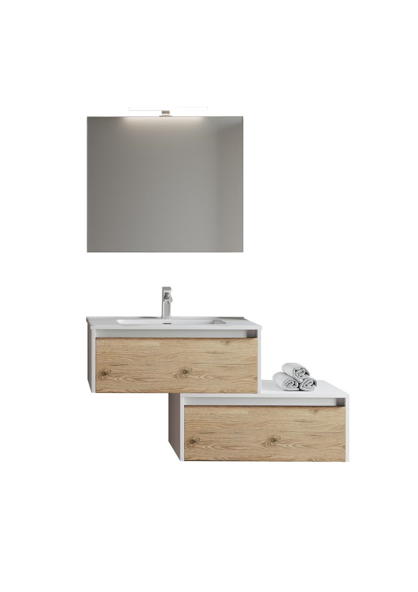 Mobile bagno formato da elementi componibili:base portalavabo e cassettoni in legno, con maniglie in metallo,apertura ammortizzata e chiusura soft closing, lavabo piatto, specchiera, lampada a led phoenix.