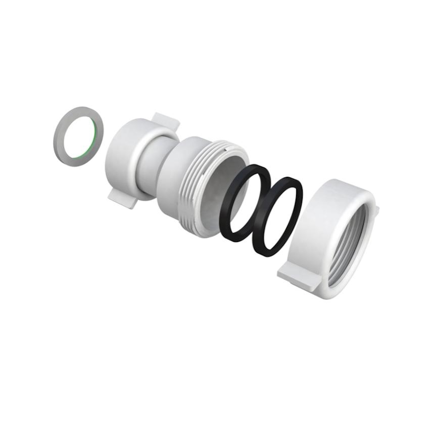 Connessione Femmina - Femmina (aumento), D.40 mm x D.1"1/4, materiale POLIPROPILENE PP, colore bianco. Applicazione: per il collegamento tra due tubi.