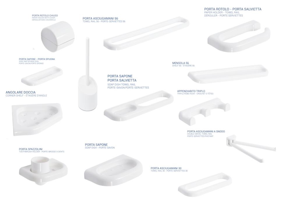 Accessori bagno in materiale Durolite e Abs. Finiture bianco. Garanzia 2. Anni particolarmente resistenti a graffi solventi e detersivi, mantenendo inalterato nel tempo il colore