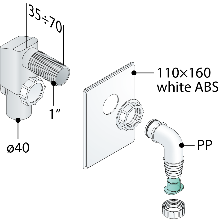 Valvola lavatrice in PVC, attacco portagomma in PP bianco, coperchio in ABS bianco 110x160, uscita D.40. Accessori e ricambi misure 1'×D.40.