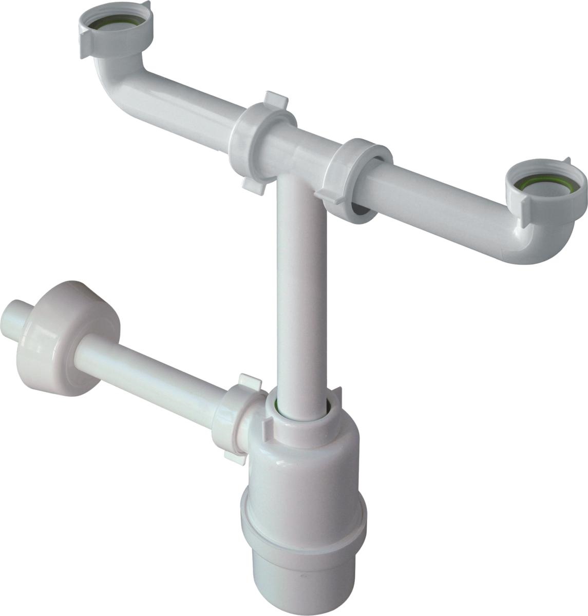 Sifone 2 Vie, attacco piletta 1"1/4, scarico D.32 x 200 mm, materiale POLIPROPILENE PP colore bianco. Applicazione: per lavelli cucina a due bacinelle, portata (l/min) 29