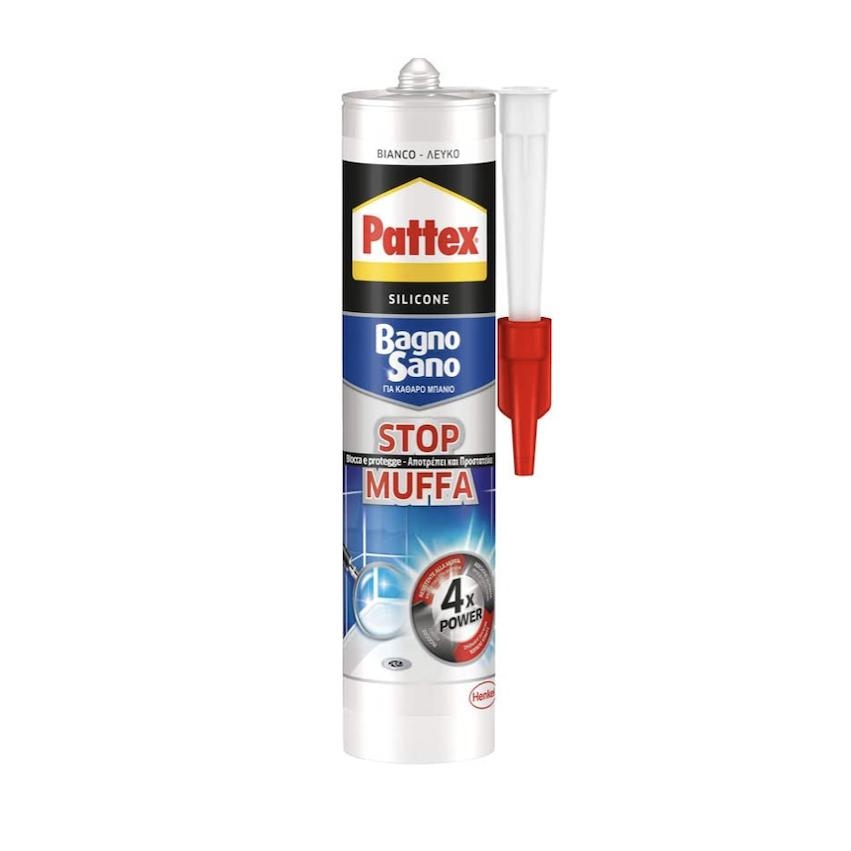 Pattex Bagno. Stop muffa. Silicone bianco formulato con l’esclusiva tecnologia Fungisafe che garantisce una tripla protezione: previene, blocca e inibisce la proliferazione delle spore di muffa sulle superfici.