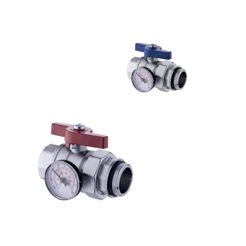 Coppia di valvole a sfera diritte con bocchettone ed attacco per collettore con tenuta O-Ring, complete di termometro scala 0÷80°C.