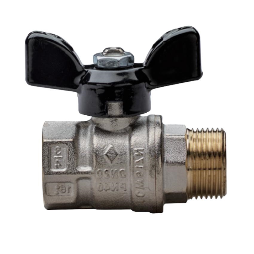 Valvola a sfera a passaggio totale, filettatura M/F, con farfalla in alluminio.