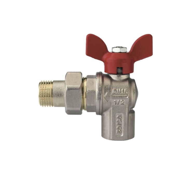 Valvola a sfera a squadro per collettori, con farfalla in alluminio. Corpo, manicotto, sfera, e asta in ottone CW617N, guarnizioni in P.T.F.E, o-ring in EPDM.