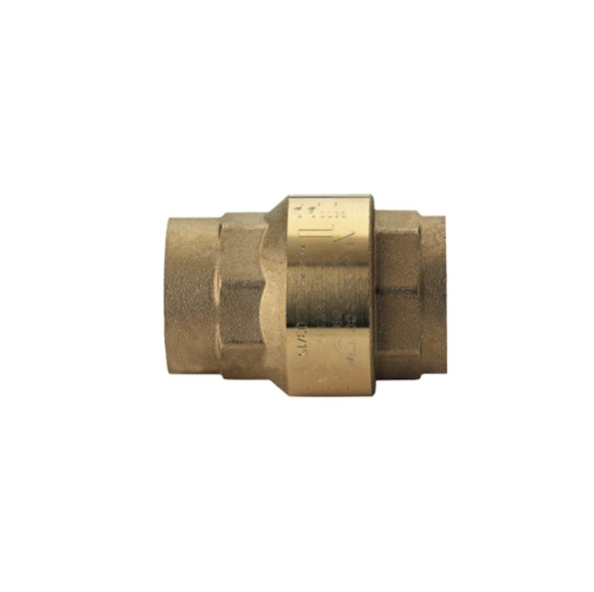 Valvola di ritegno a passaggio totale, filet- tatura F/F. Corpo in ottone CW617N UNI EN12165, manicotto ottone CW617N UNI EN12165, otturatore 302PEI ULtEM 1000, guarnizione piana NBR, molla acciaio INOX AISI.