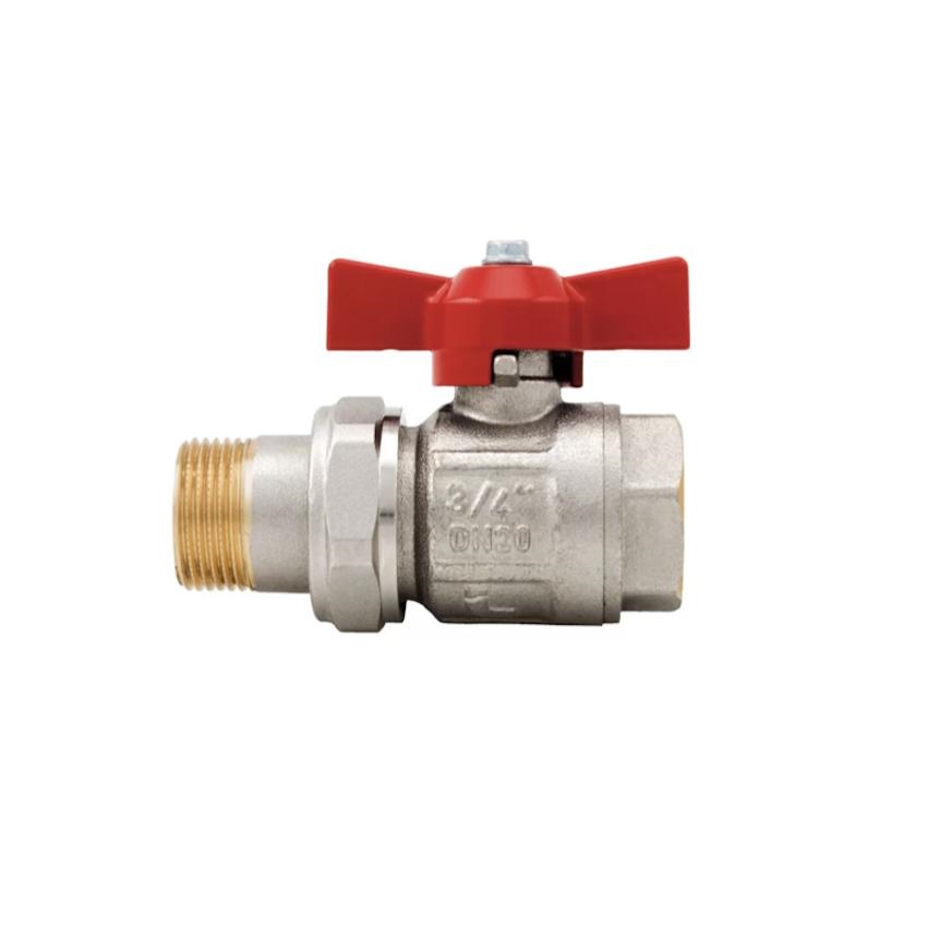 Valvola a sfera in ottone nichelato, a passaggio standard. filettatura M/F, con raccordo per collettori. Farfalla alluminio rossa.