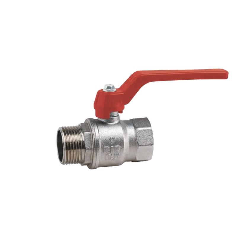 Valvola a sfera serie BEST in ottone nichelato, a passaggio standard. filettatura M/F. Leva piatta rossa in acciaio.