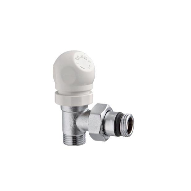Valvola termostatizzabile angolo per tubi rame, plastica o multistrato, con manopola, senza raccordo. Disponibile con cappuccio di protezione (Art. 114C/1).